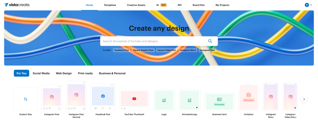 VistaCreate graphics software supports a wide range of creative projects—from graphic design and animation to photo and video editing. Its templates are well-organized and include industry-specific options for platforms such as Instagram, Meta, YouTube, and Pinterest.